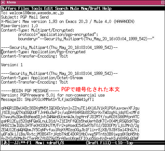 先頭に表示されている"E"は暗号化されたメイルを表します。1 E05/20 "Seminar User PGP Mail Send qANQR1DBwU4Dc38DXqMN ^^^^^^^^^^^^^^^^^^^^^^^^^^^^^^^^^^^^^^^^^^^^^^^^^^^^^^^^^^^^^^^